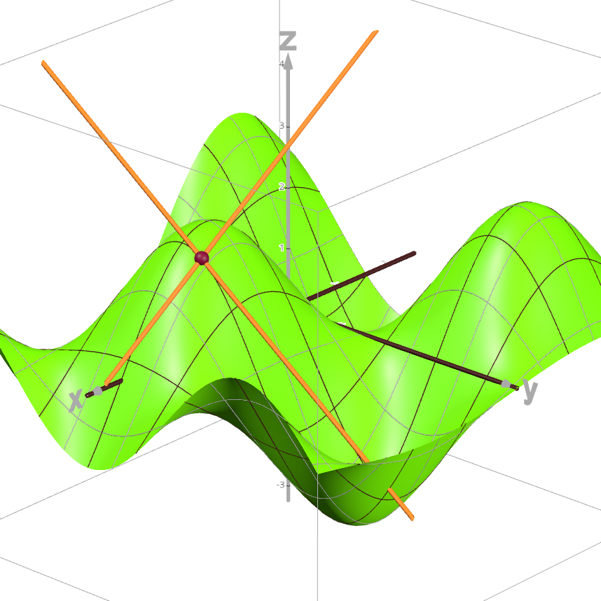 Functions are not limited to taking only a single independent variable as input. We refer to a function of more than one independent variable as a multivariable function. For example, \(f(x,y)\) is the formula for a 2-variable function, and letting \(z = f(x,y)\) we can consider the graph of \(f,\) a surface, in three dimensional \(xyz-\)space. For such a multivariable function \(f\) with formula \(f(x,y)\) its partial derivatives with respect to \(x\) and \(y\) are defined and denoted as: