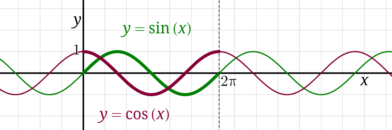 The length of that principal domain, \(2\pi,\) is referred to as the period of sine and cosine.