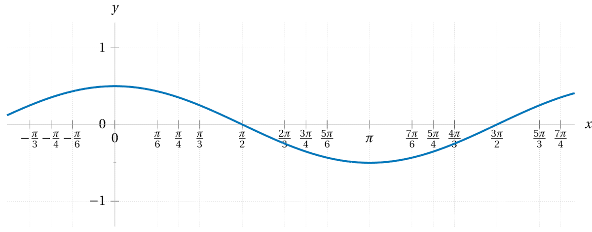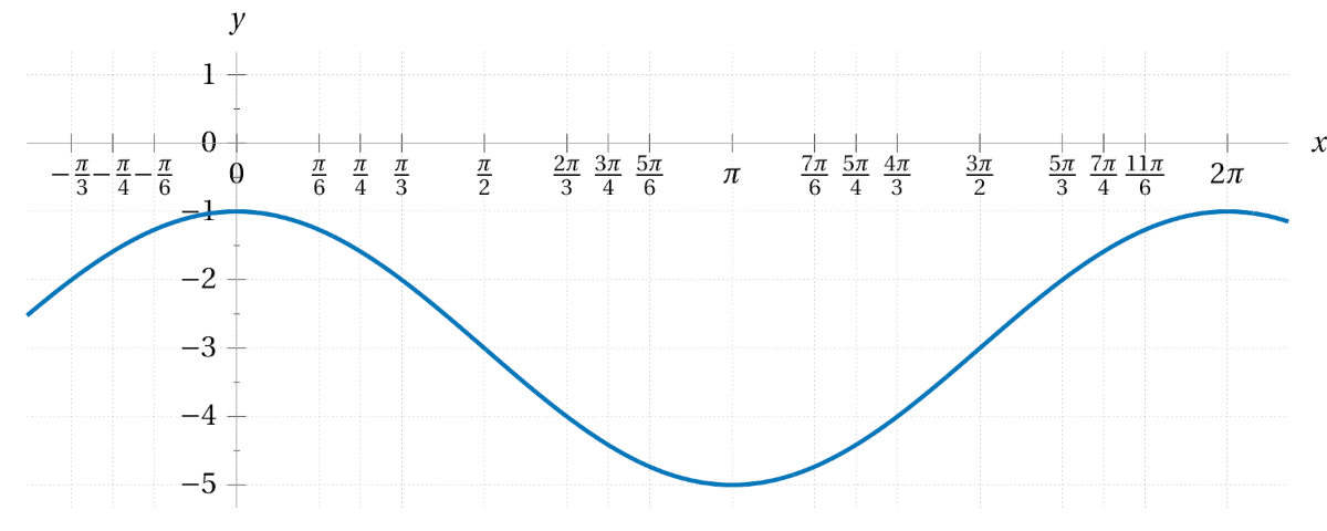 Each of the following plots feature the graph of a transformation of the cosine function. First sketch the graph of \(\cos(x)\) for reference. Then write down the formulas for the functions graphed below thinking of them as a transformation of the cosine function.