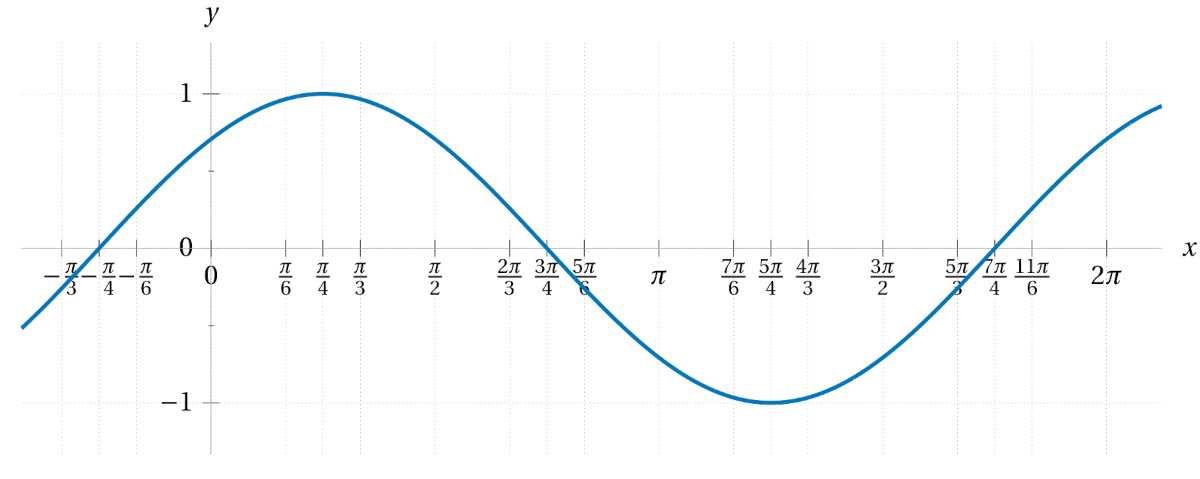 \(\displaystyle 2\sin\bigl(x\bigr) \)\(\displaystyle \sin\bigl(2x\bigr) \)\(\displaystyle \sin\bigl(x+2\bigr) \)\(\displaystyle \sin\bigl(x\bigr)+2 \)\(\displaystyle \sin\bigl(x+\tfrac{\pi}{6}\bigr) \)\(\displaystyle \tfrac{1}{3}\sin\bigl(4x\bigr) \)\(\displaystyle 5\sin\bigl(\tfrac{1}{2}x\bigr) \)\(\displaystyle \sin\bigl(x-\tfrac{\pi}{3}\bigr)-1 \)\(\displaystyle \sin\bigl(\tfrac{1}{3}(x+\tfrac{\pi}{4})\bigr) \) - With regards to each of the transformations in the previous exercise, affirm the meaning of the vocabulary terms period, amplitude, and phase shift.